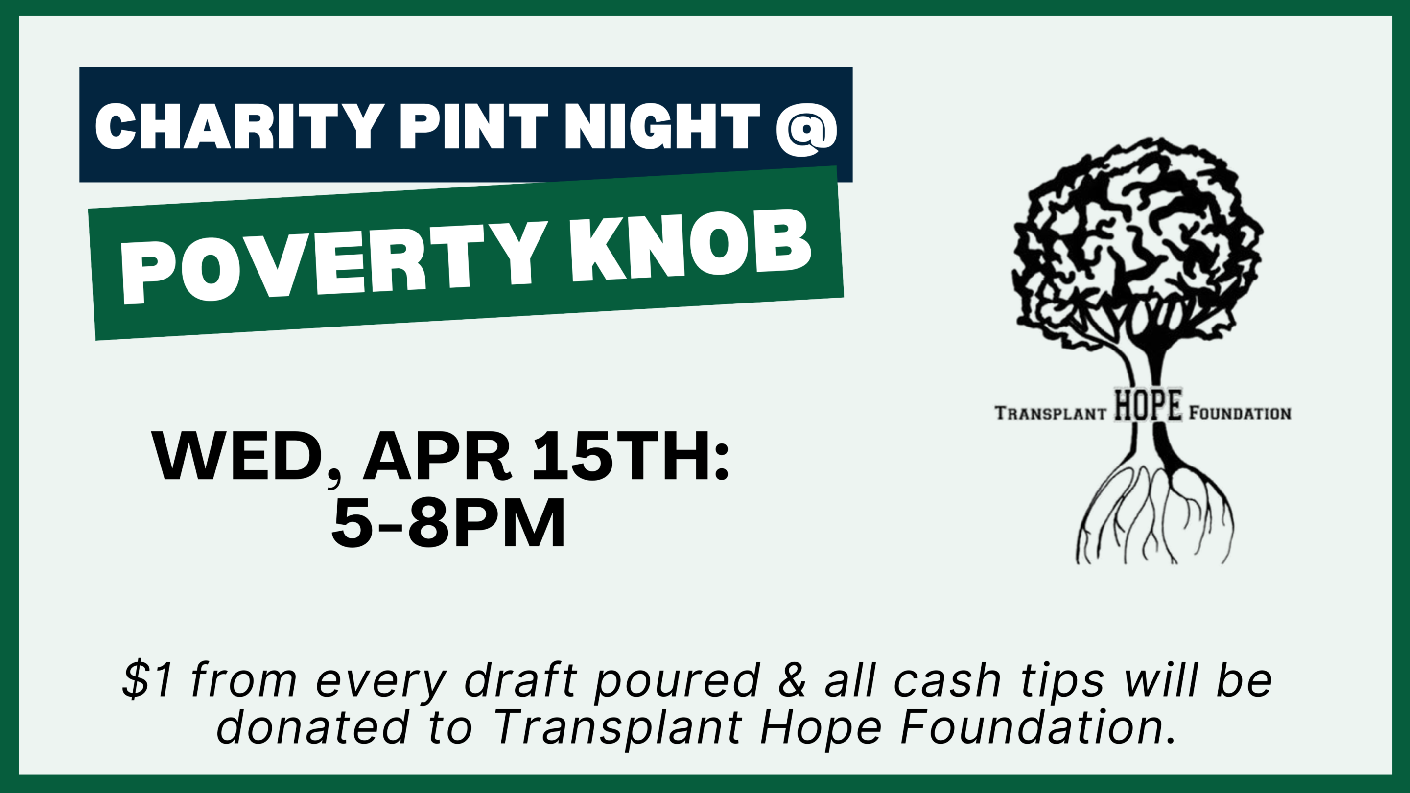 Help us raise money for Transplant Hope Foundation on Wednesday, April 15th from 5-8PM! For every draft poured, we will donate $1 as well as ALL CASH TIPS. Please come out and support a great local nonprofit with us! Poverty Knob is family & dog friendly!